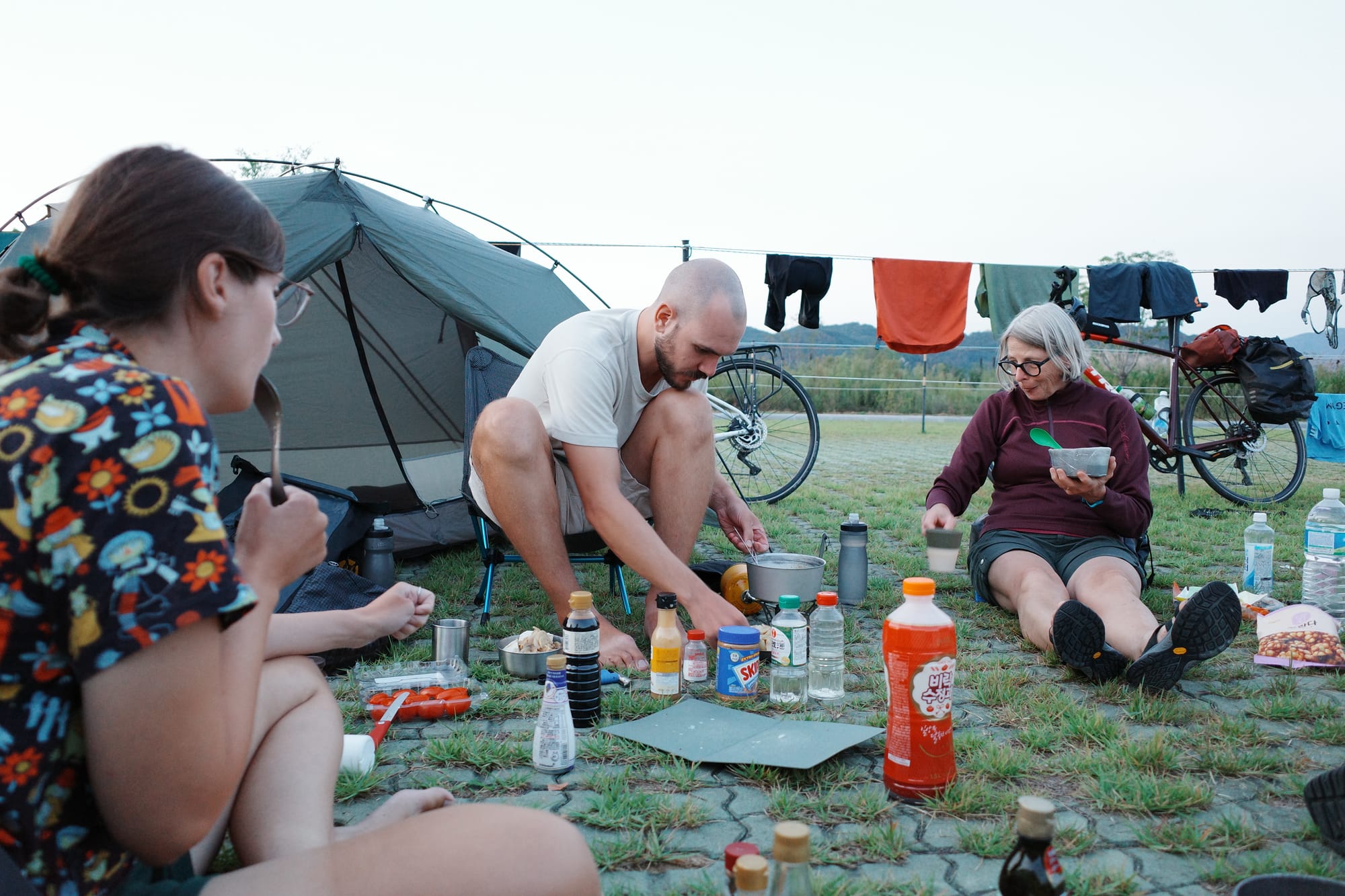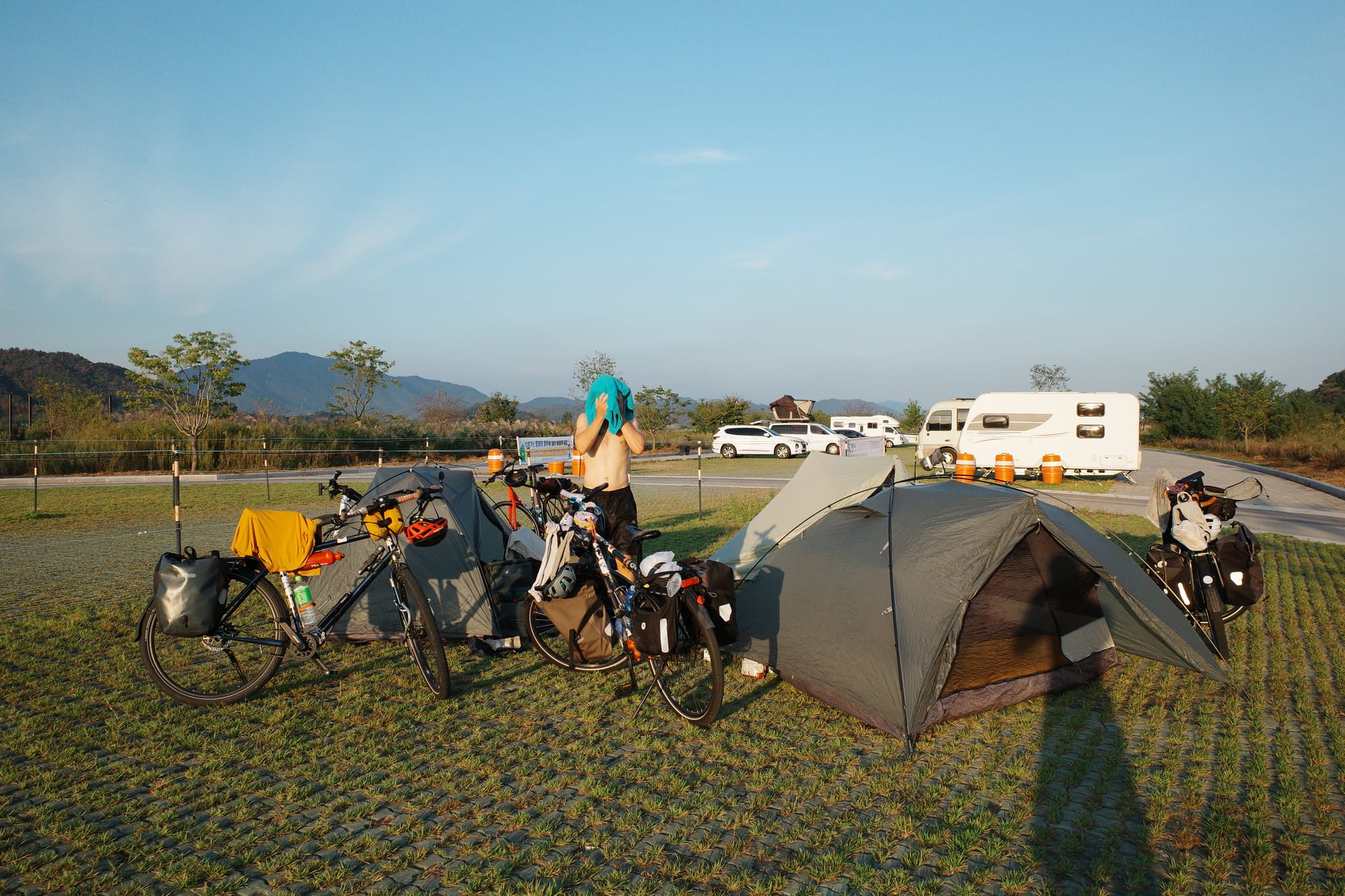 Velo zu fahren mit guter Infrastruktur, angenehmen Temparaturen und wenigen Höhenmetern mal einge gemütliche Abwechslung, dazu war auch keine Routenplanung nötig, da wir einfach dem Fluss folgten. Wir sind jedoch die meisten Tage weiter gefahren, als wir geplant hatten. Fast jeden Tag kam es vor, dass unser geplanter Campingplatz nicht existierte, voll war oder auch einfach eine Onlinereservation nötig ist, welche wir ohne koreanische Telefonnummer nicht buchen können. Da war die Dame an der Reception leider wenig flexibel. Irgendwie haben wir aber immer was gefunden, sei es ein gemütliches Glamping-Zelt oder auch mal ein Hotel an den regnerischen Tagen.