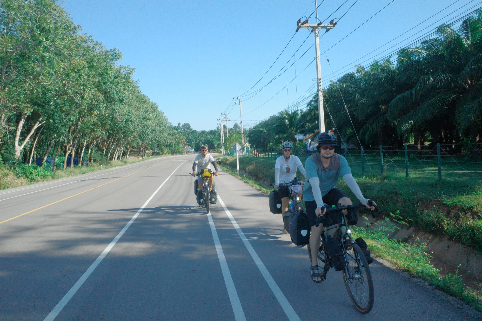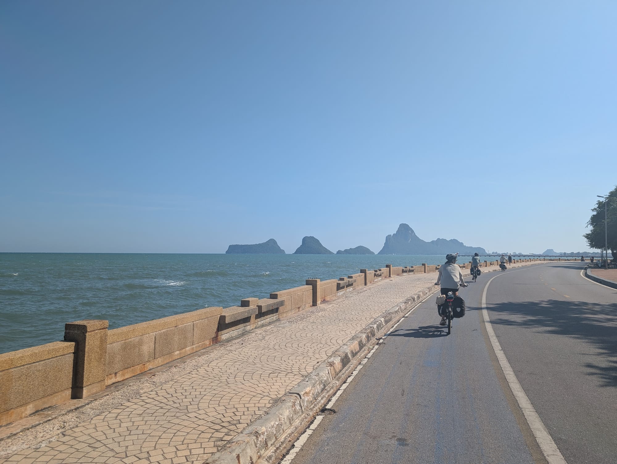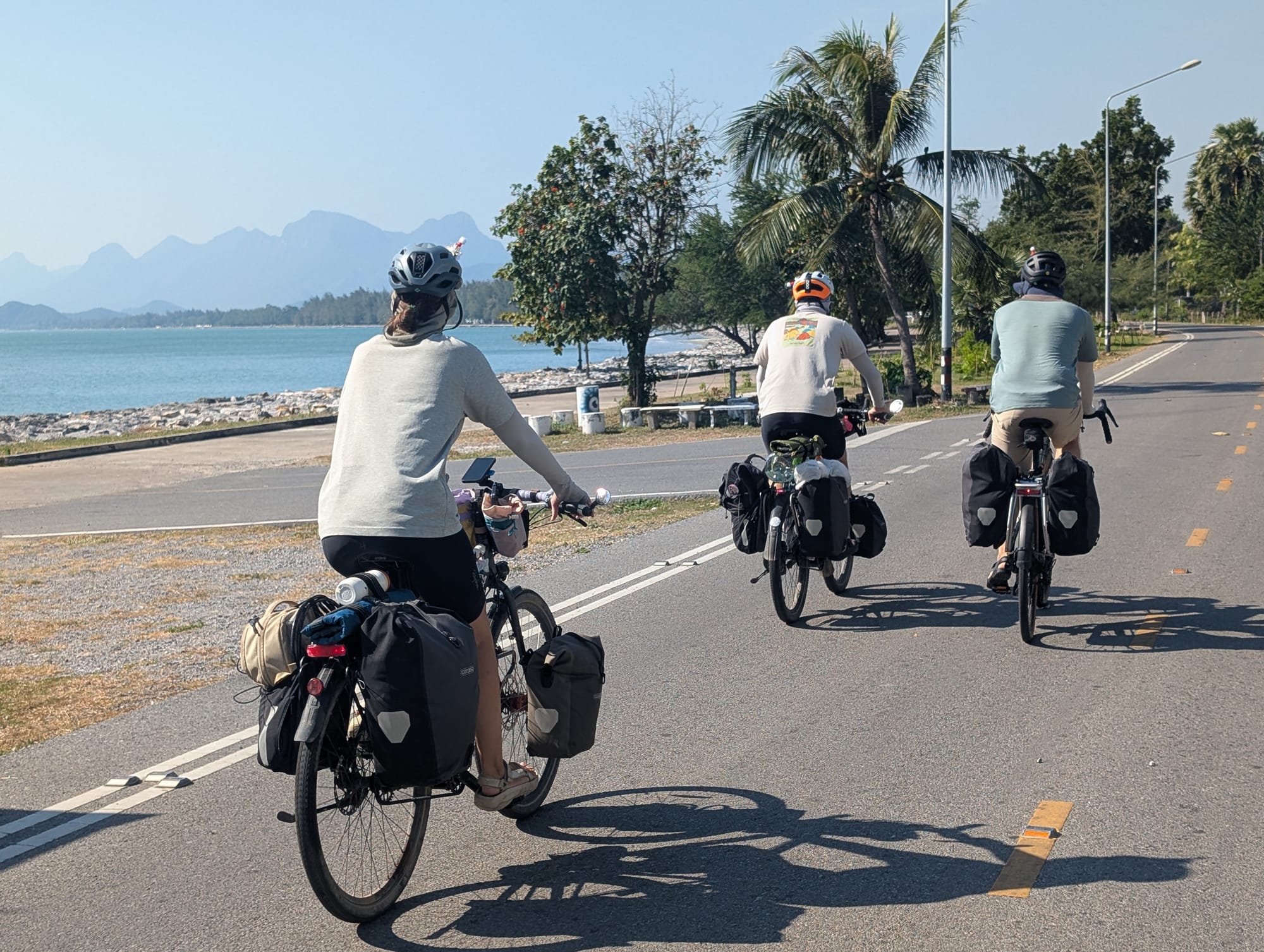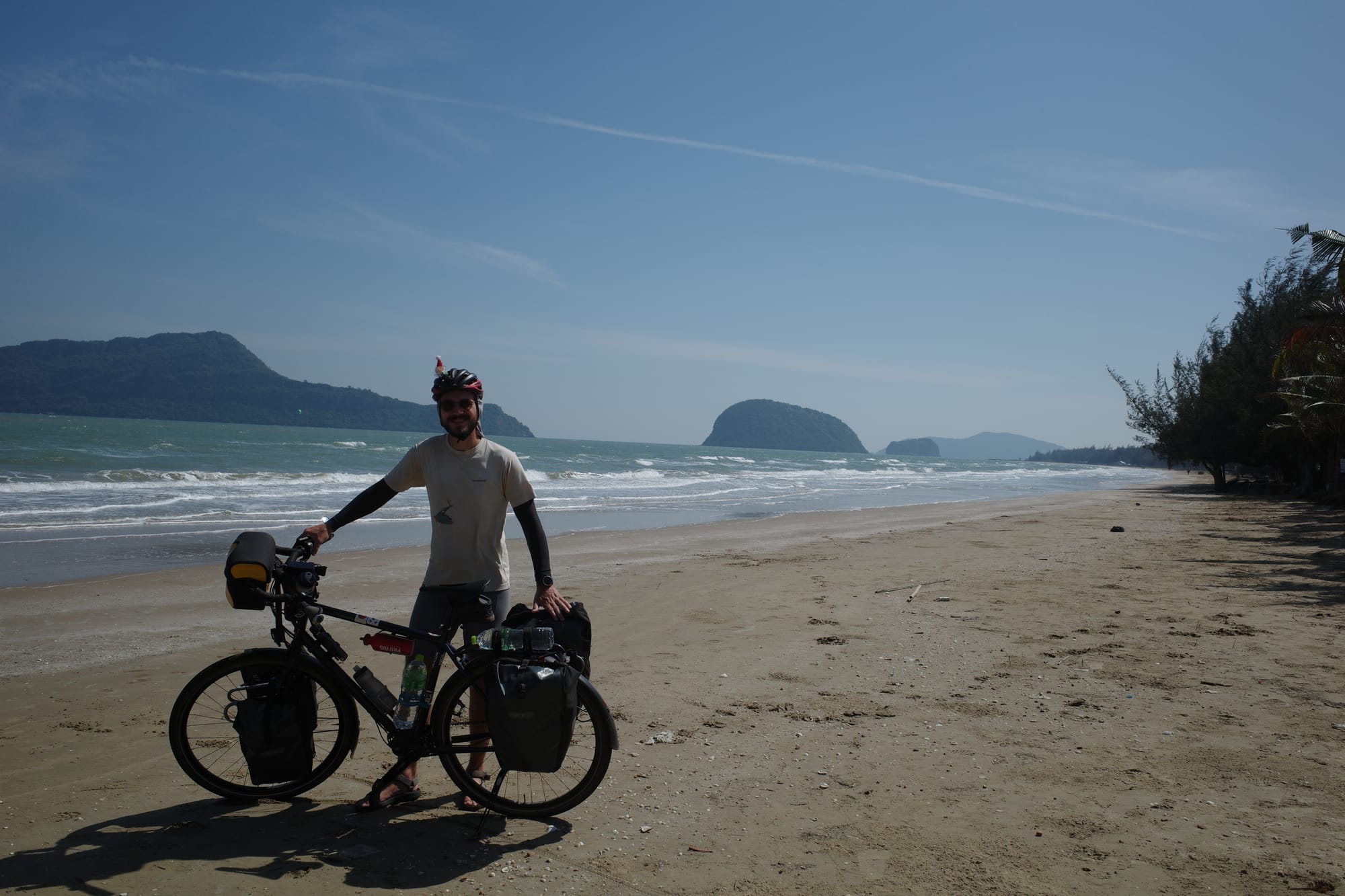 Es ging weiter der Küste entlang und wir kamen in den Genuss der thailändischen Strände. So konnten wir am Strand mittagessen, direkt mit den Velokleidern ins klare Wasser für eine Abkühlung und dann nochmals einige Kilometer weiter fahren.